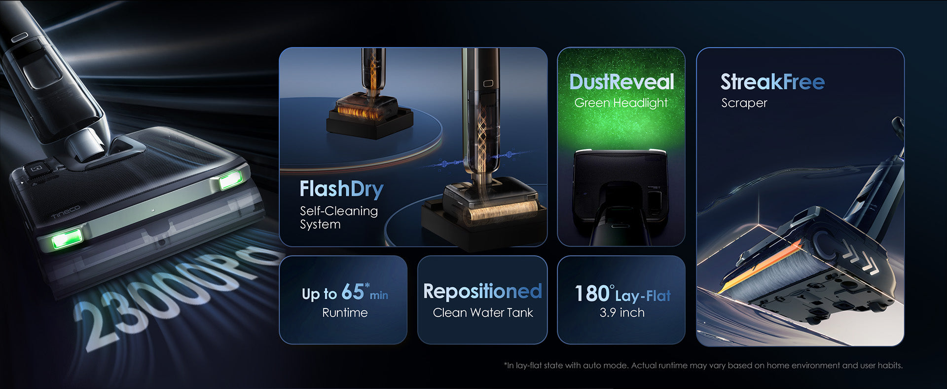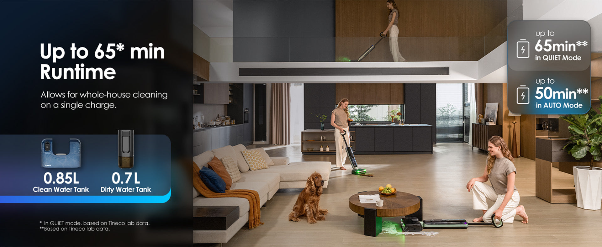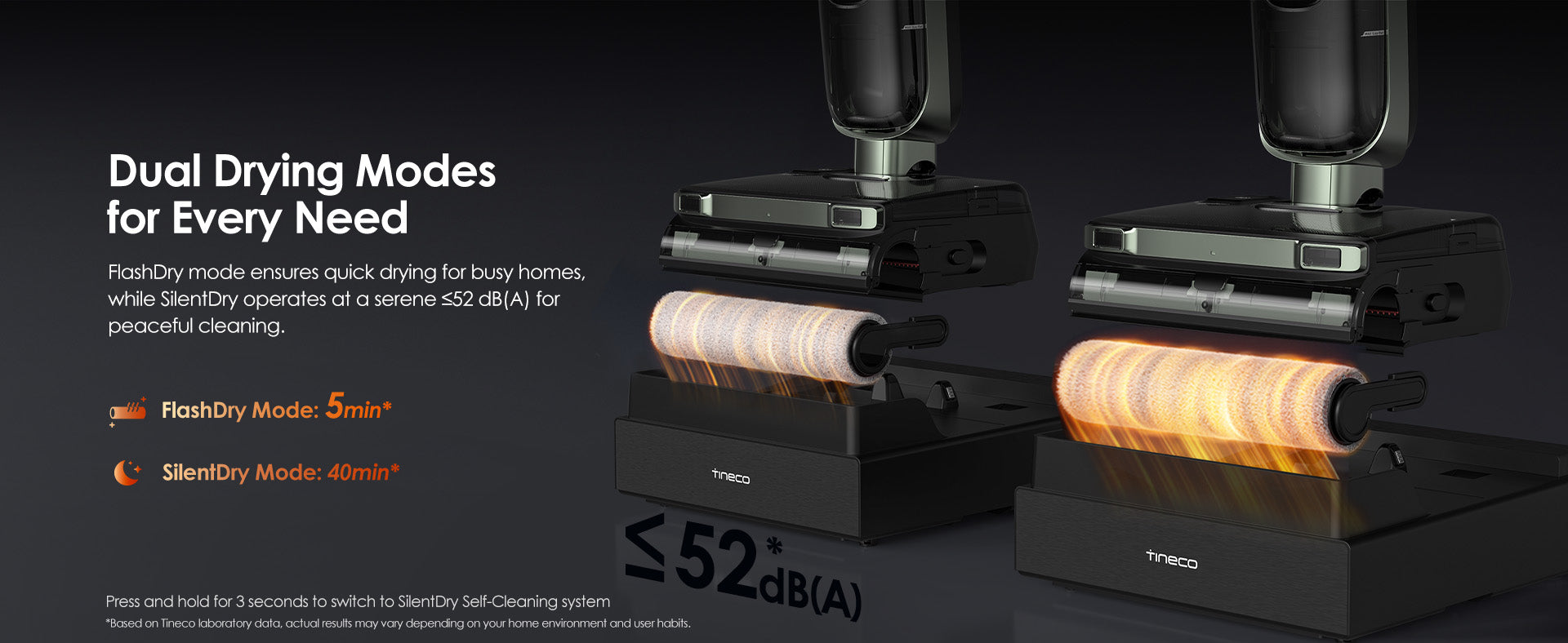 Self-cleaning with heated water & drying with 185℉ (85℃) hot air. Dual drying modes for every need. FlashDry Mode: 5min* SilentDry Mode: 40min* (*Based on Tineco's lab data.)