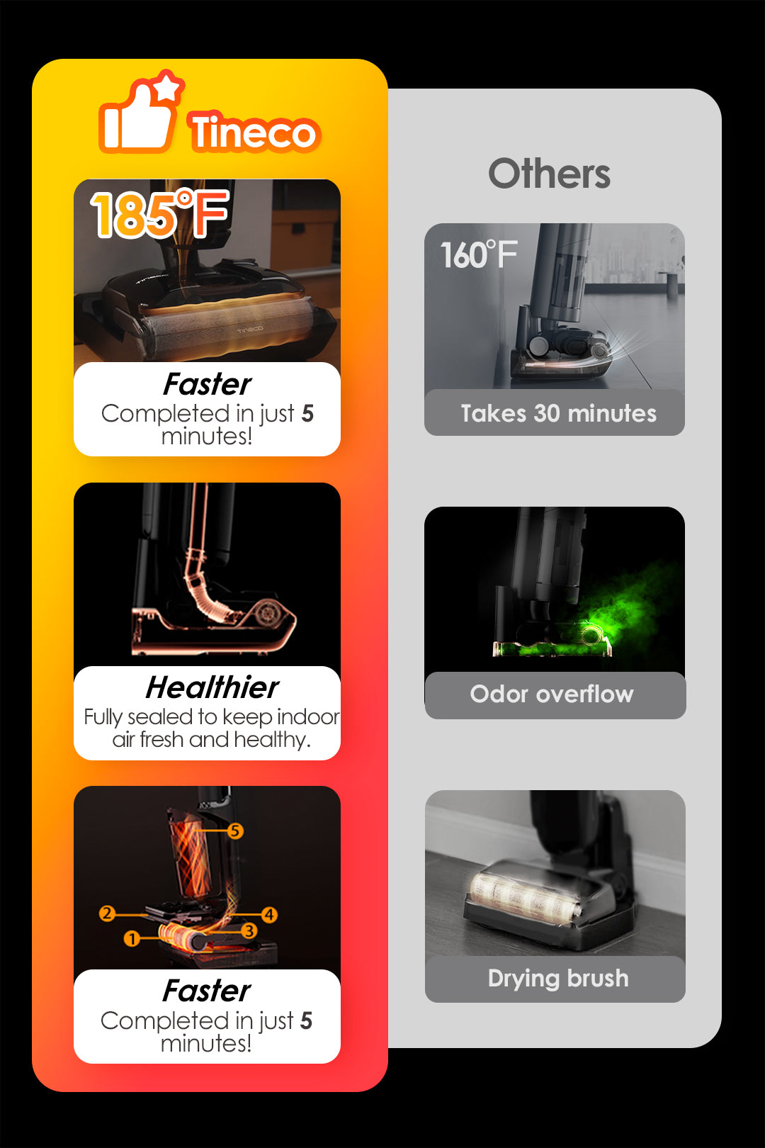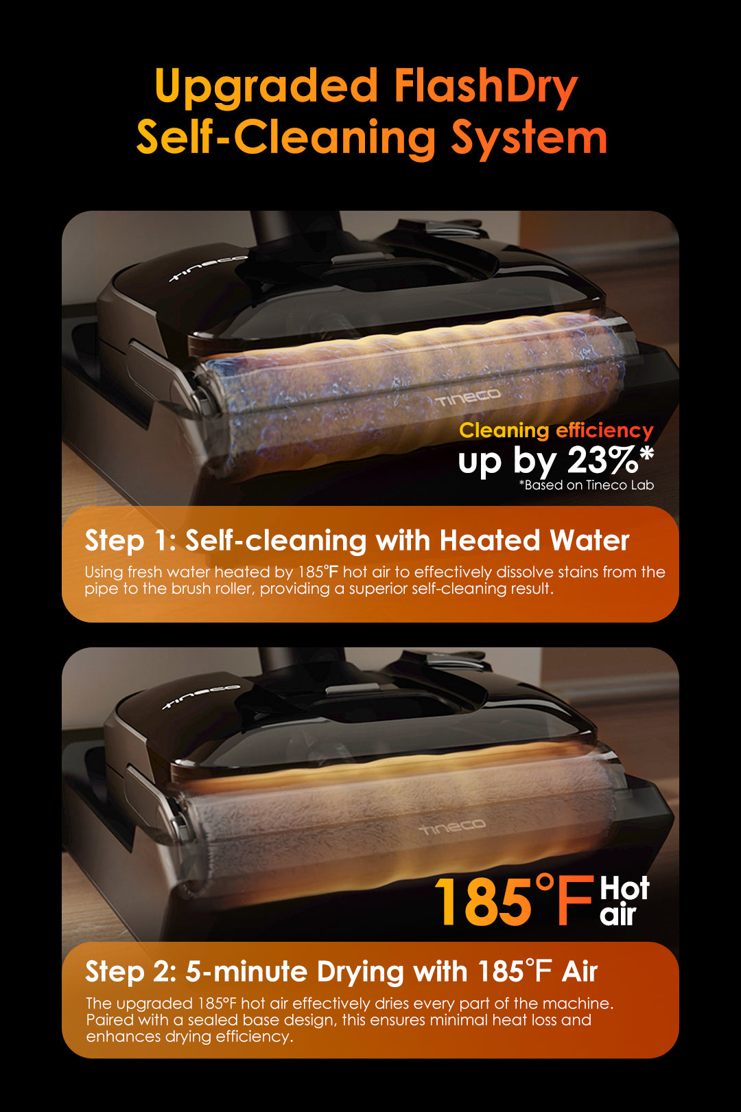 Using heated fresh water to dissolve stubborn stains from the pipe to the brush roller, then 185°F hot air to dry every part—equipped with hepa filters, a good filtration system, and a removable dirty water tank as key extra features, making it great for cleaning with zero post-use hassle.