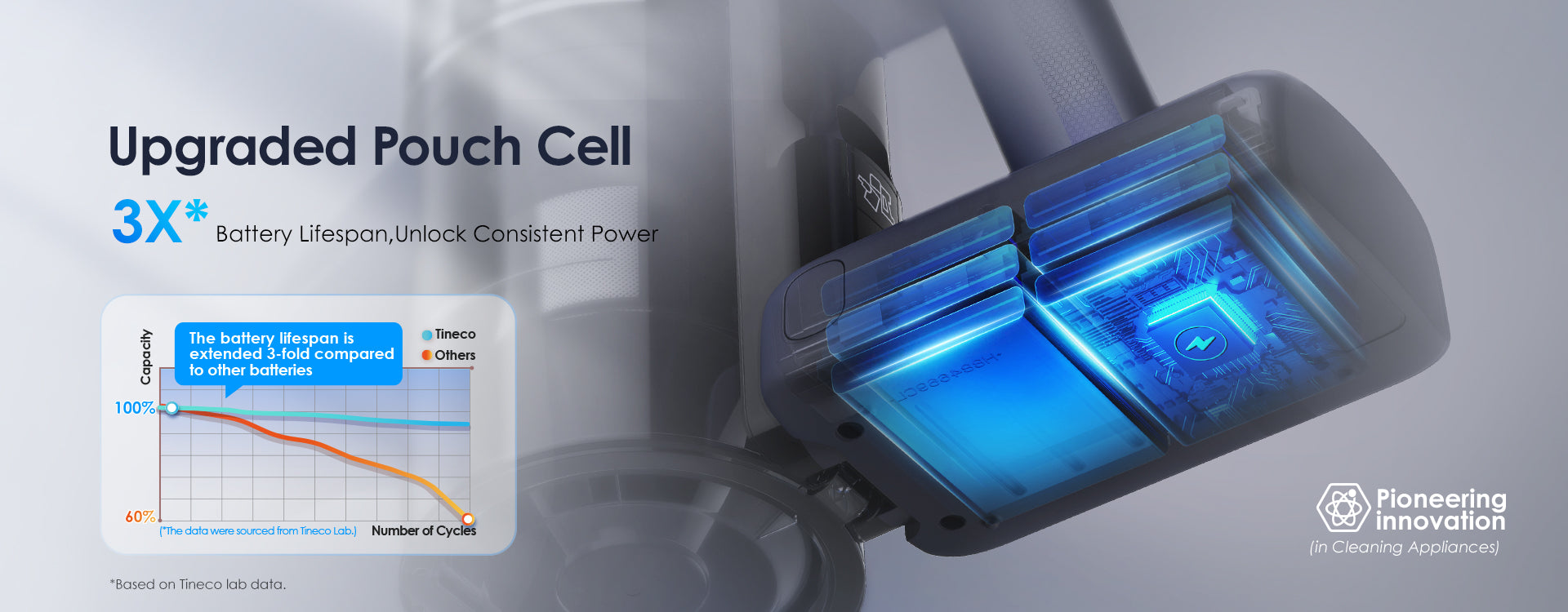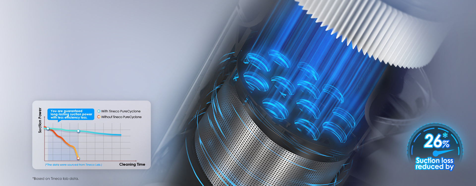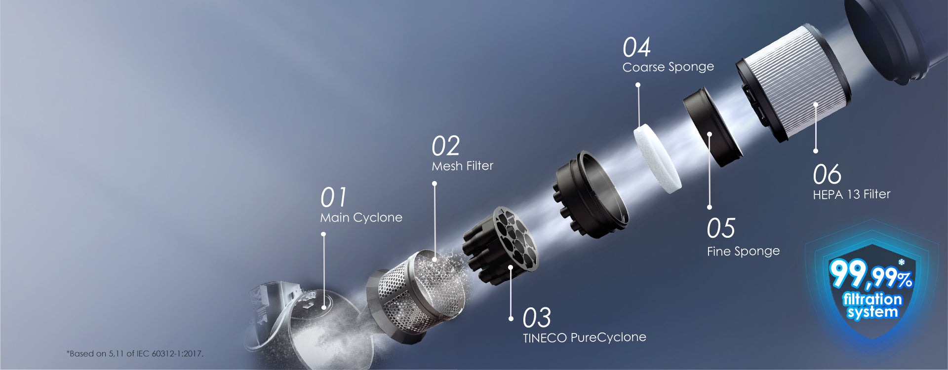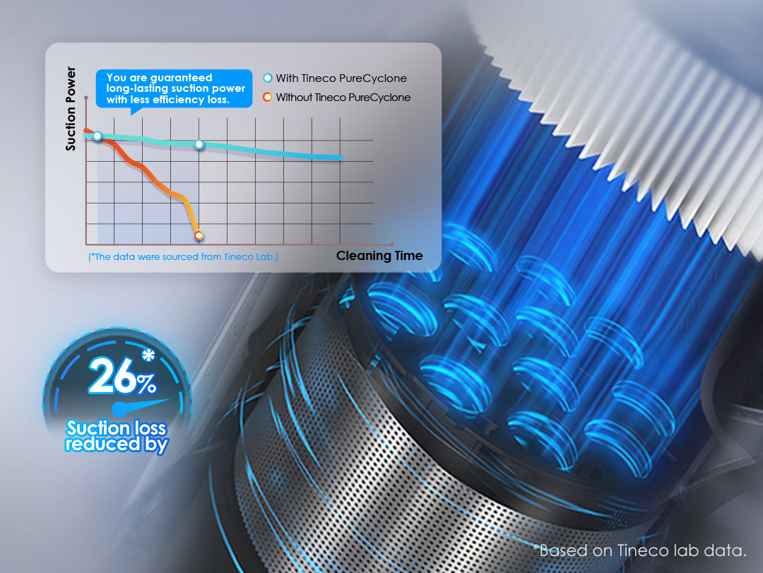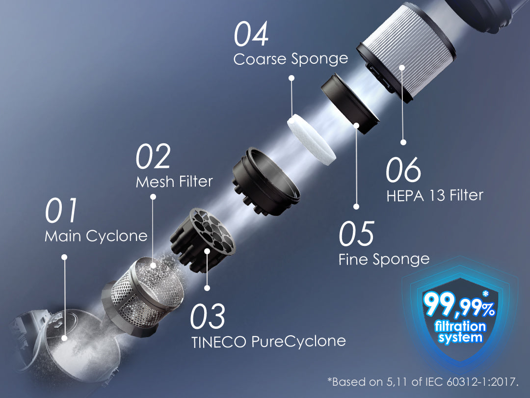owerfully separates air and dust, capturing up to 99.99%* of dust and debris as small as 0.3 μm, preventing filter clogging or suction loss, and ensuring strong and fade-free suction power.*Based on 5.11 of IEC 60312-1:2017.