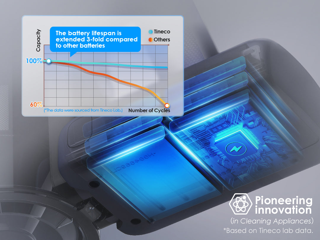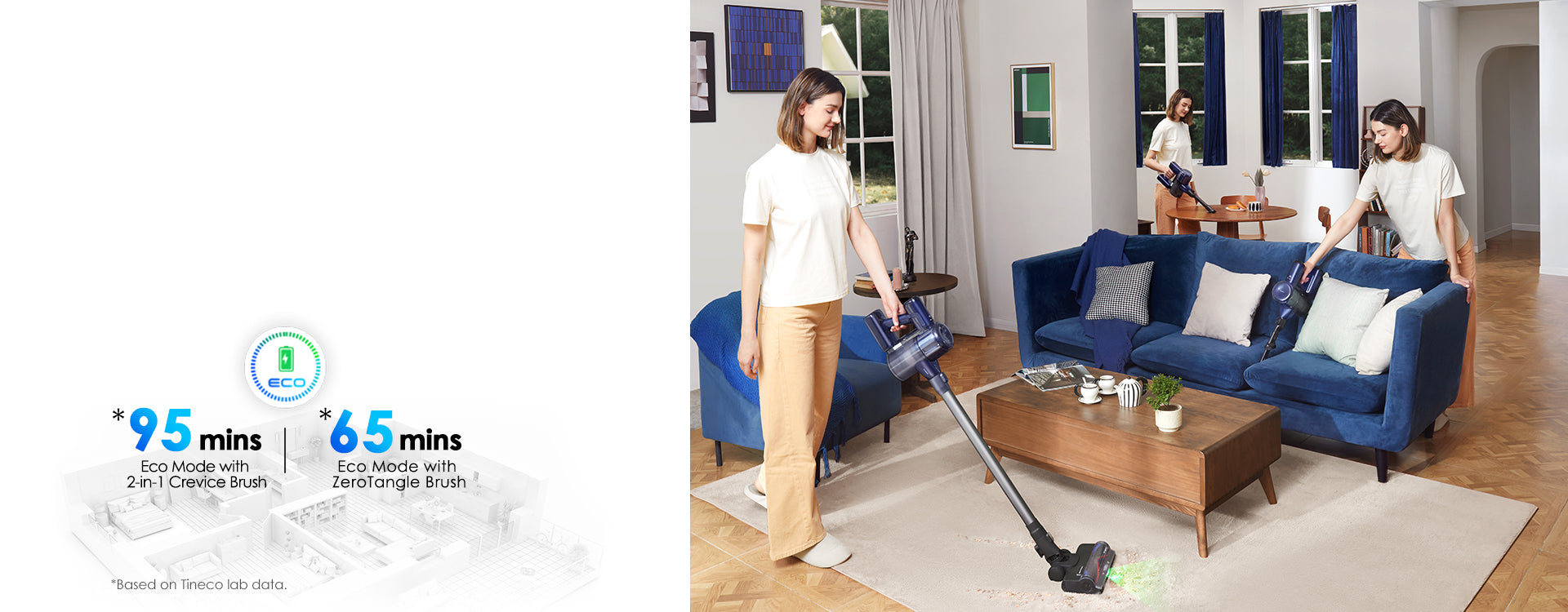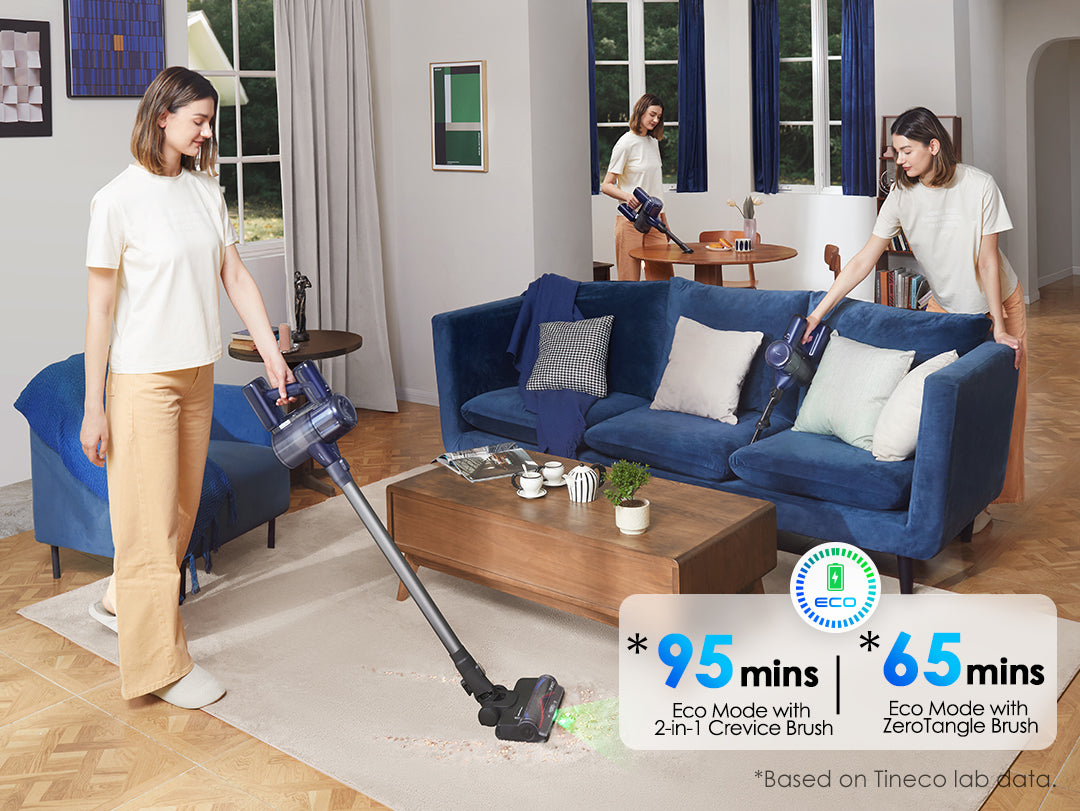 Allows for uninterrupted whole-house cleaning, with up to 95* minutes in Eco Mode using the 2-in-1 Crevice Brush and 65* minutes with the ZeroTangle Brush.*Based on Tineco lab data.