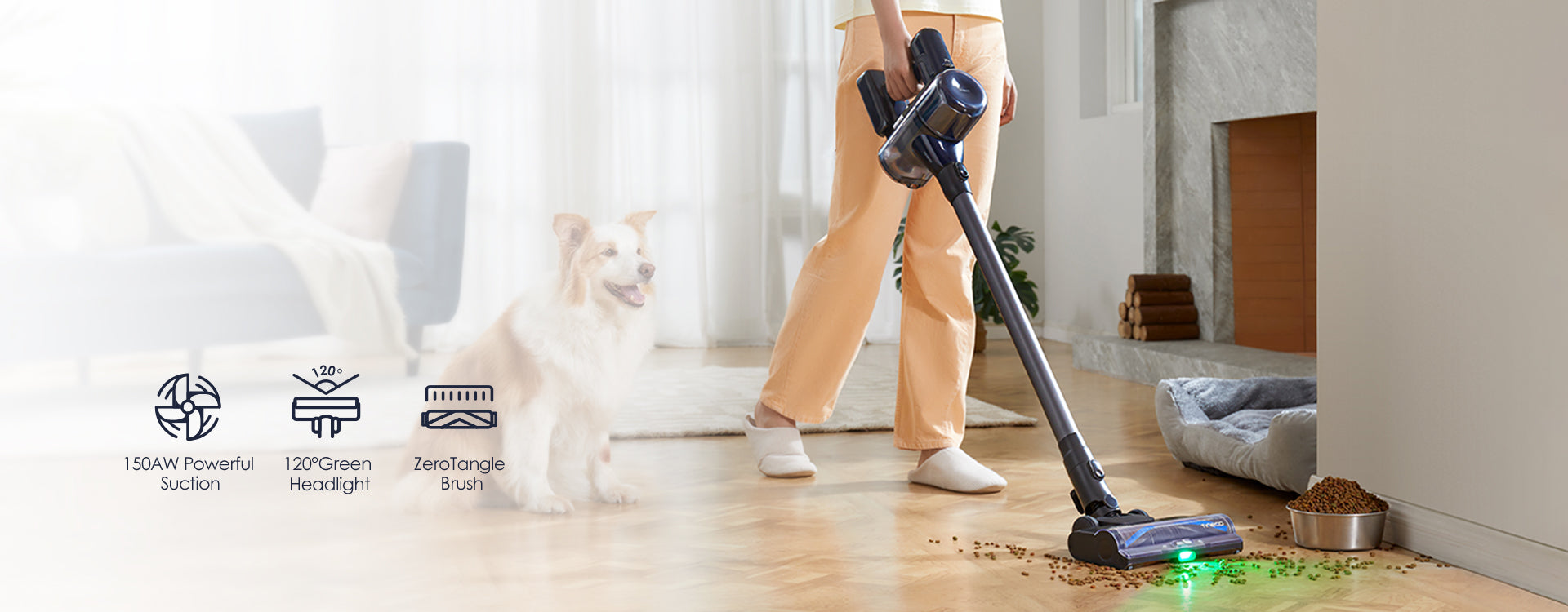 Provides a 150AW suction that swiftly captures dust, debris, and pet hairs, ensuring thorough cleaning. Suitable for everyday cleaning on both carpets and hard floors.