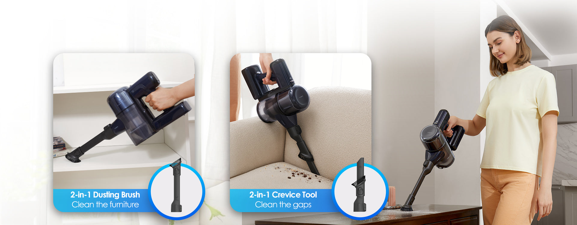 Effectively tackles dust, debris, and hair on multiple surfaces,from carpets to hard floors.Effortlessly handles everyday cleaning.