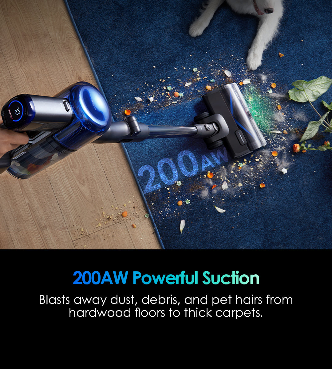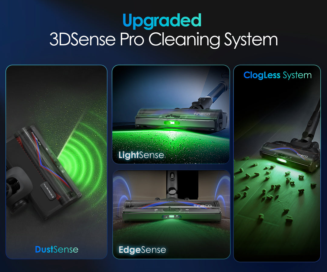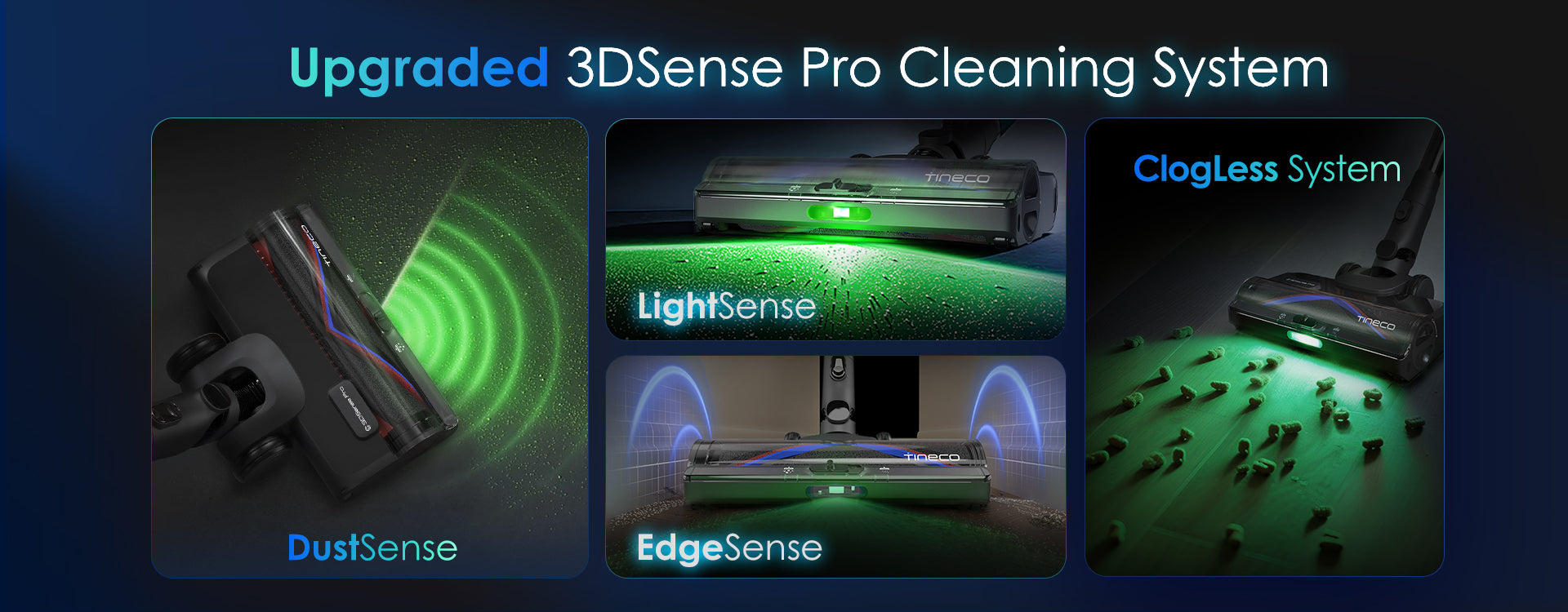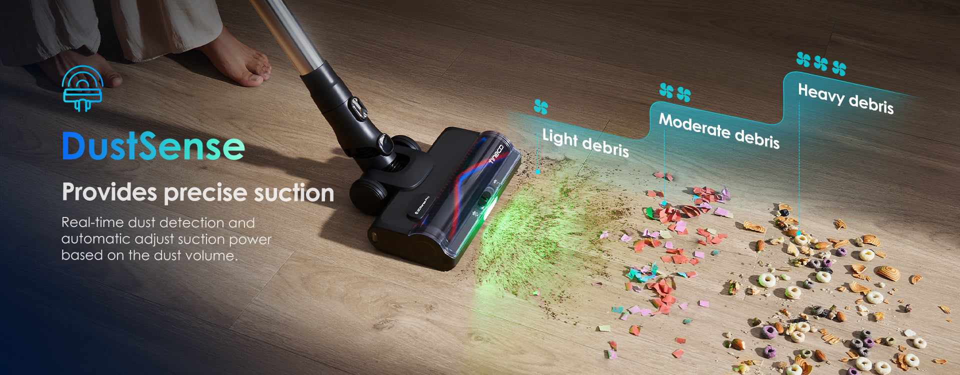DustSense:Precise suction with real-time dust detection and automatic power adjustment based on dust volume.LightSense:150° wide-angle headlight illuminates a larger area and clearly reveals dust particles as small as 0.02mm.EdgeSense:Edge-to-edge cleaning with automatic suction boost near walls.ClogLess System:Upgraded brush and 219% larger suction inlet area for clog-free large debris cleaning.