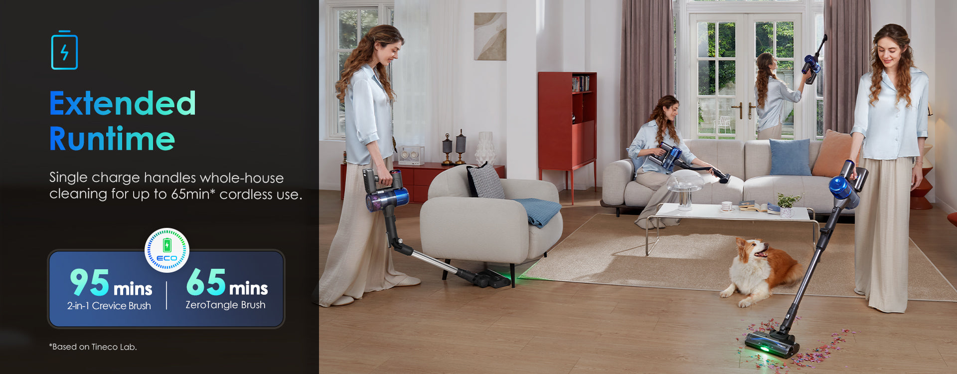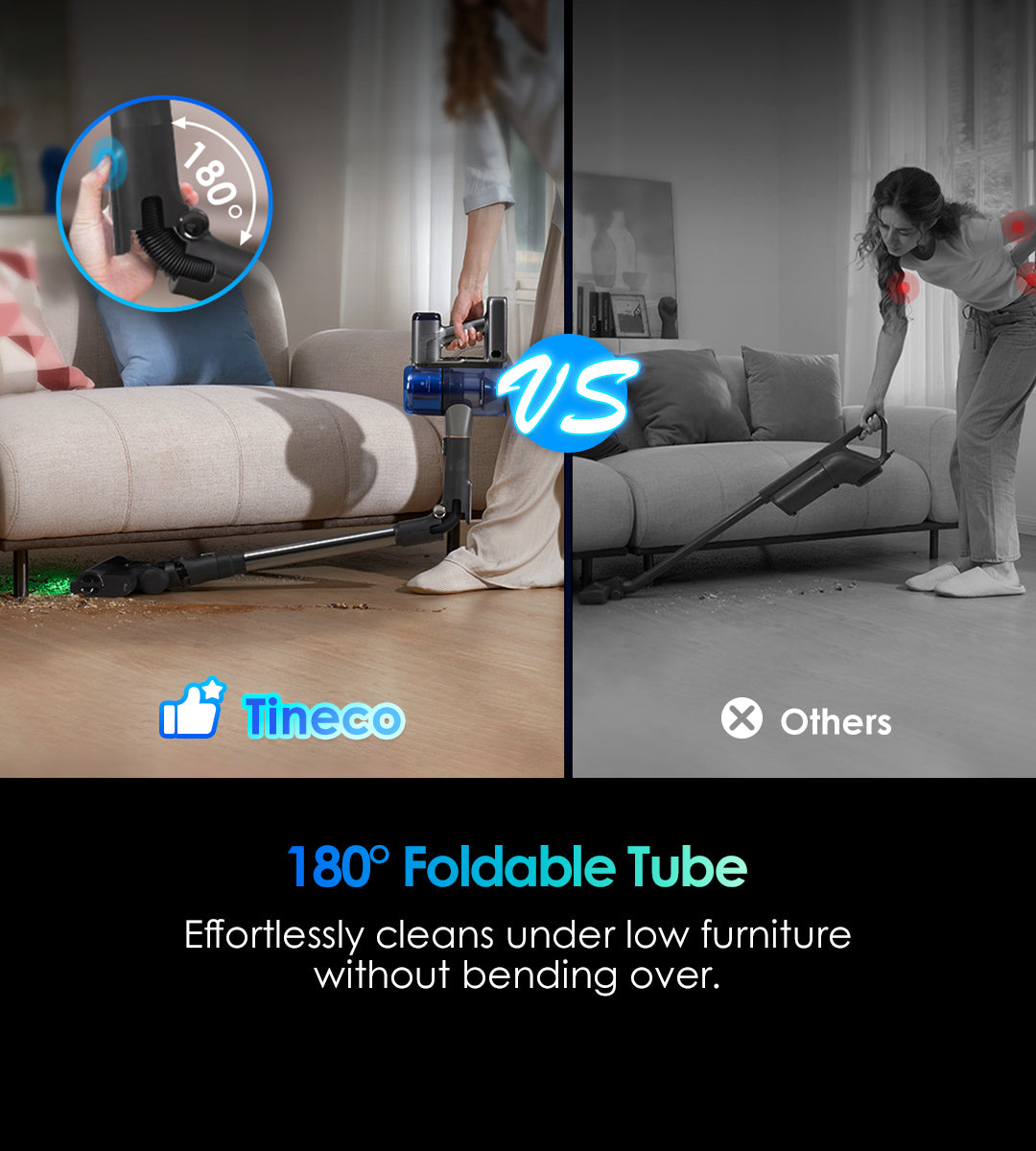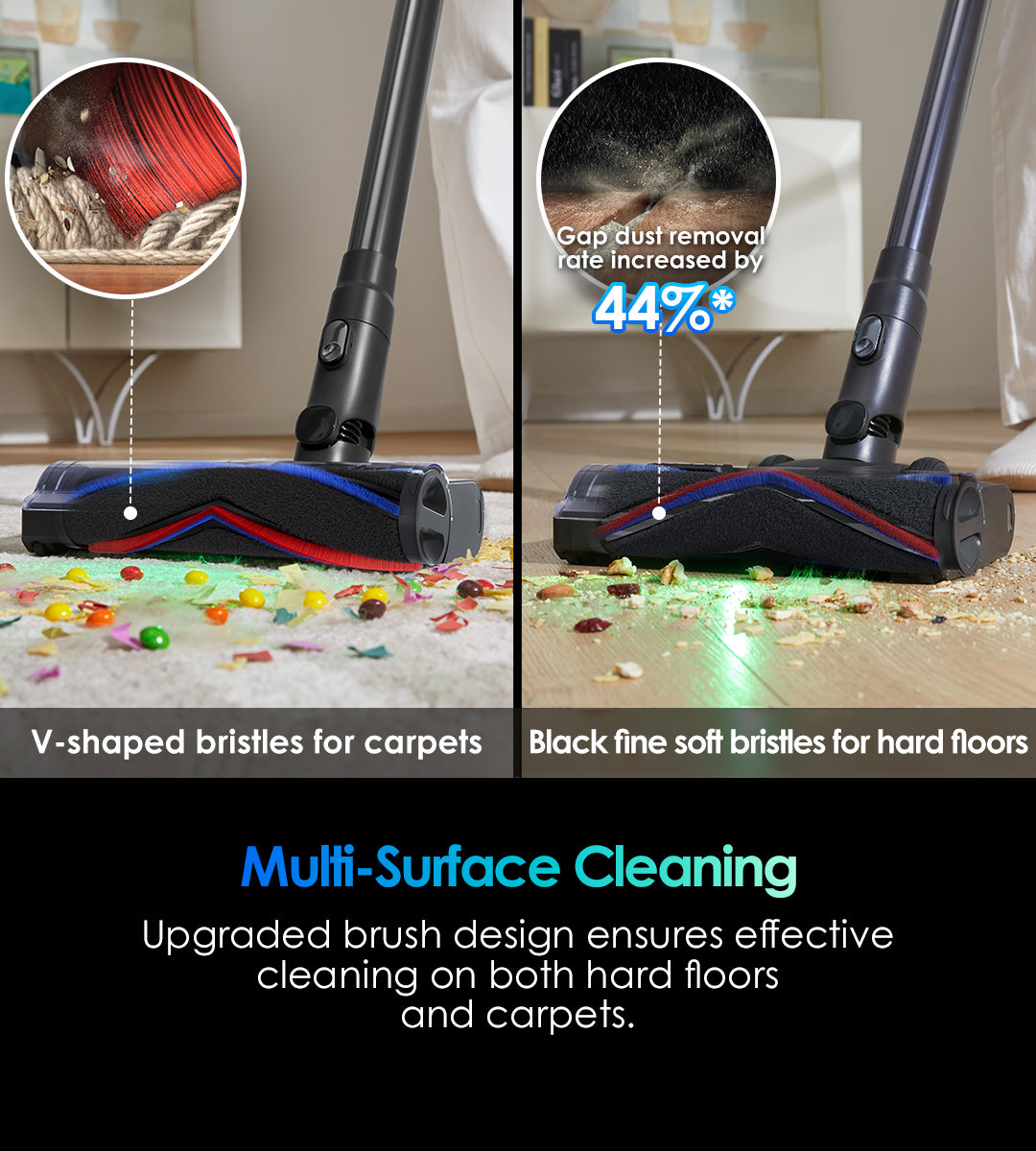 Upgraded brush design ensures effective cleaning on both hard floors and carpets without changing brushes.V-shaped bristles for carpets.Black fine soft bristles for hard floors, with a 44%* improvement in gap dust removal rate.